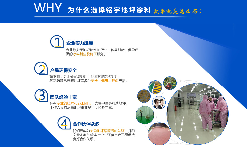 安徽銘宇建材科技有限公司是一家致力于地坪涂料的行業,旗下有金剛砂耐磨地坪,環氧樹脂砂漿地坪,環氧防靜電自流地坪,停車場防滑地坪,混凝土密封固化劑和丙烯酸球場,無震動止滑車道、塑膠跑道、工廠地板漆等工程施工服務。 憑借本身的技術能力和研發條件,加上多年對環氧地坪和耐磨硬化地坪等各類工業地坪的涂裝、施工的實踐經驗、技術己處于國內專業水平,經檢測機構檢驗符合相應的技術標準。同時安徽銘宇建材科技有限公司還組建了經驗豐富的工程技術隊伍以及工程施工隊伍、簡歷了完善的售后施工服務體系,滿足用戶的需要。 安徽銘宇建材科技有限公司是一家積極創新、倡導環保的涂料銷售及施工服務的廠家,安徽銘宇建材科技有限...